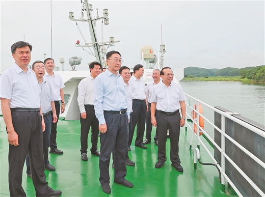 7月29日,自治区党委书记刘宁深入南宁横州市、钦州灵山县实地调研平陆运河项目建设情况。这是刘宁从横州市飞龙渡口乘船,一路沿江察看平陆运河项目建设、航道1标施工和水下施工作业有关情况。本报记者 黄 克/摄