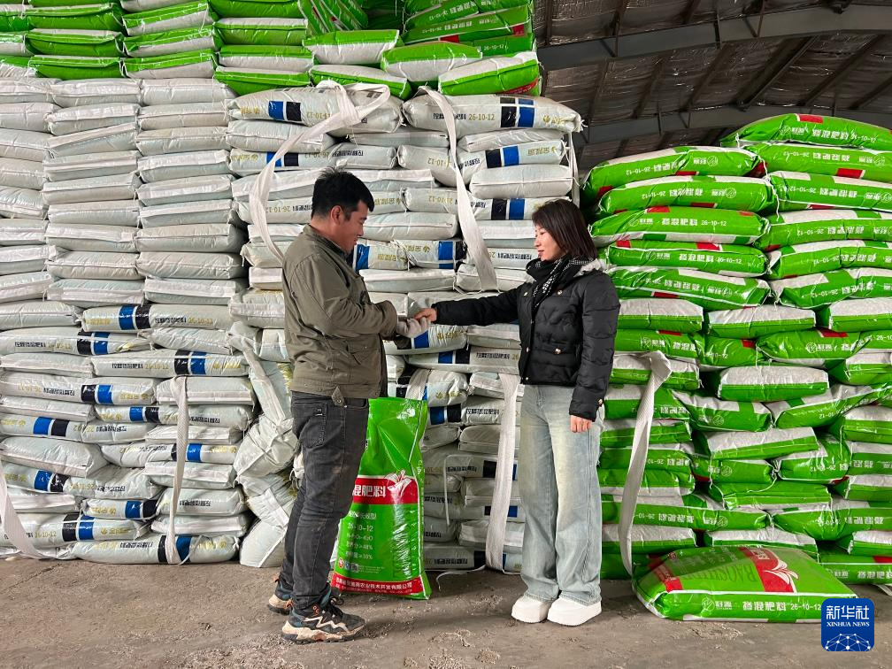 韩凤香在跟工作人员沟通化肥相关事宜。新华社记者 司晓帅 摄