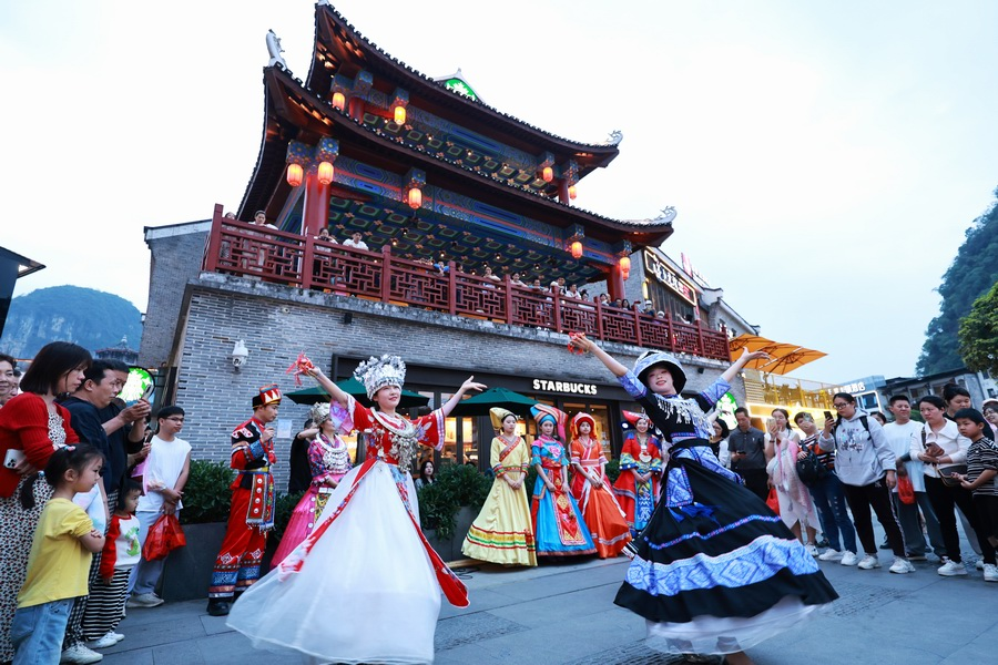 三月三期间,为打造阳朔特色文化和旅游演艺精品项目,阳朔县在西街主入口及中央水域广场等地举办“山歌舞乐百姓大舞台”系列文化旅游活动,深入挖掘和展示阳朔本地的特色文化内容、文化符号、文化故事,以旅游促进文化传播。(杨永泉、廖青)