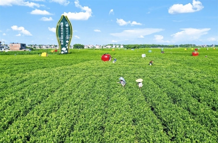 近年来,横州市不断延伸茉莉花产业链,积极打造茉莉花“1+9”产业集群,加快构建全产业链融合发展体系,让茉莉花香飘得更远。图为横州市国家现代农业产业园万亩茉莉花田。 (黄汝德 摄)