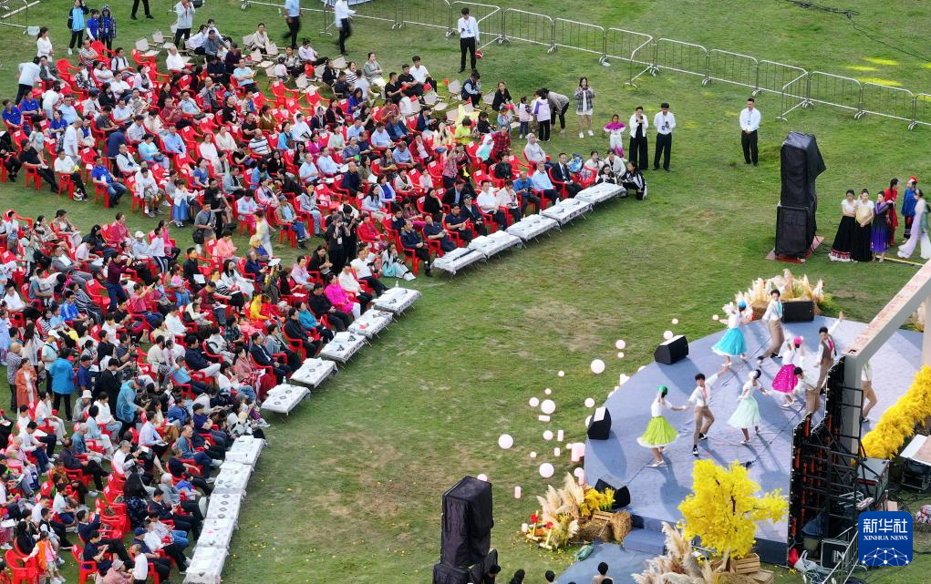 10月1日,游人在广西南宁市武鸣区双桥镇那宫屯观看南国乡村音乐会(无人机照片)。