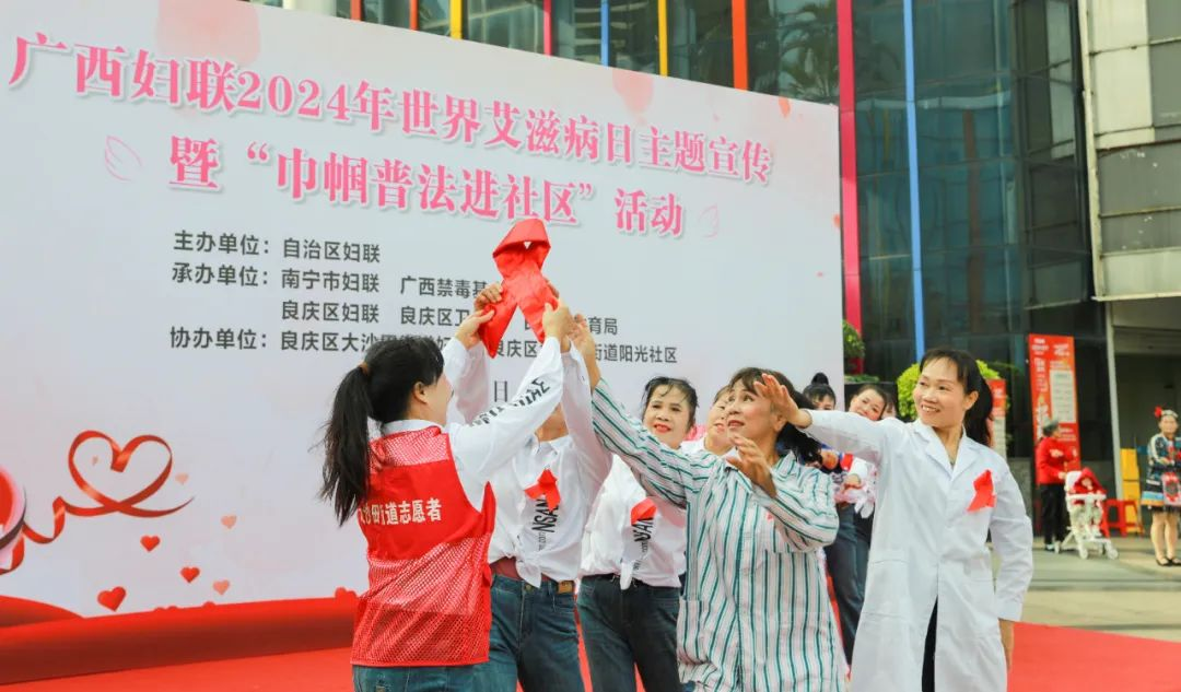 近日,广西各级妇联以第22个“国际反家庭暴力日”、第37个“世界艾滋病日”、第11个“国家宪法日”为契机,通过融入式、互动式、零距离的宣传方式,广泛开展群众喜闻乐见的巾帼普法宣传活动,把健康、法律知识和服务送到广大群众身边,积极引导大家树立健康生活理念、增强法律意识,筑牢“安全墙”守护“生命线”,用法律武器保障合法权益,共建平安和谐家庭。