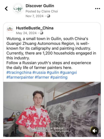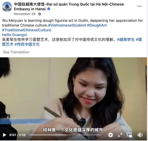 中国驻越南大使馆官方脸书账号转载桂林国际融媒体中心制作发布的越南留学生在桂林学习面塑的视频