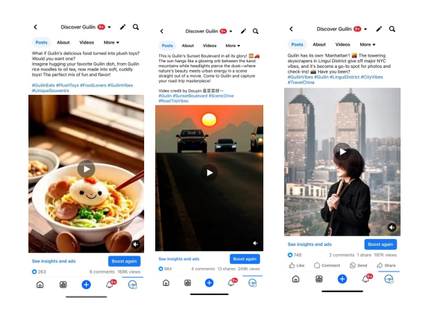 2022年4月,新华网与桂林市委宣传部合作,率先成立国际融媒体中心,将“编辑部端口”前移海外,并在Facebook(脸书)、X、Instagram(照片墙)YouTube(优兔)四大平台开设账号,实现国际传播运营机构和运营模式提档升级。2024年以来,桂林海媒账号以“讲好桂林故事,传播桂林声音”为核心,围绕桂林的山水风光、历史文化、生态保护、乡村振兴、高质量发展等主题,融合短视频、图文、直播等多种形式,成功加深海外受众对桂林、对广西、对中国的友好认知。