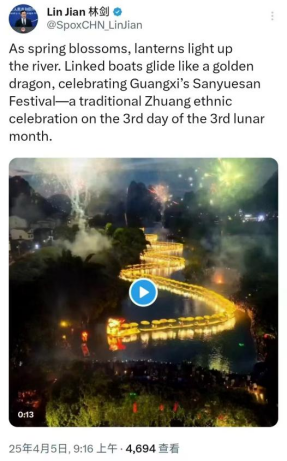 外交部发言人林剑在X账号上推介桂林阳朔遇龙河金龙巡游