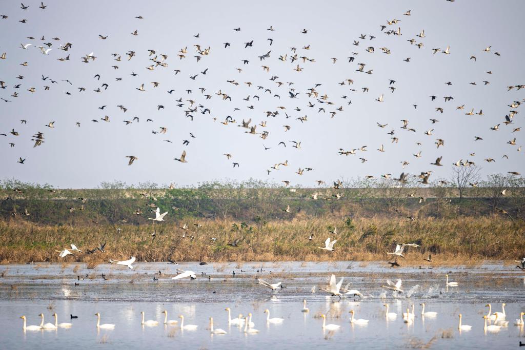 长江入海口,上海崇明东滩候鸟栖息地浅滩与潮沟相间,水鸟悠然栖息于草丛之间。作为“中国黄(渤)海候鸟栖息地(第二期)”的遗产地之一,每年有大量鸟类在这里过境、停留。