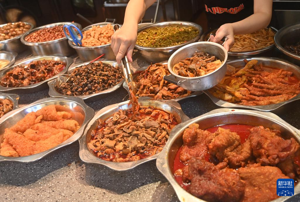 在广西南宁市一家螺蛳粉店,服务员为螺蛳粉添加配料(9月18日摄)。