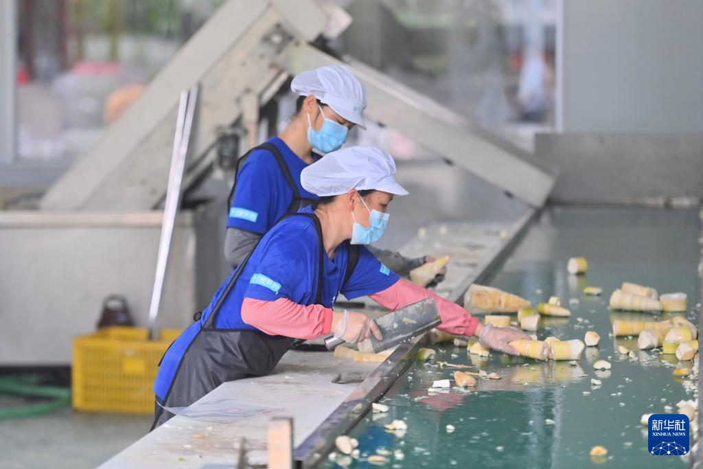 在柳州笋丫头农业有限公司,工人在加工竹笋,准备生产螺蛳粉原材料——酸笋(7月11日摄)。