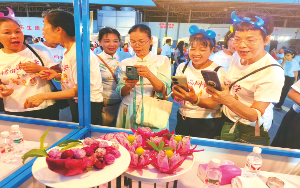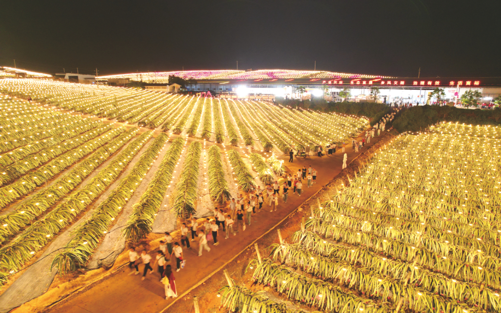 “眼睛和味蕾都忙不过来。”游客李女士说,万亩火龙果灯海突然亮起,好像星河坠落人间,十分震撼。她忍不住拿出手机拍个不停,每一张都是氛围感大片。水果美食展位更让人惊喜,连空气里都飘着让人开心的甜意。