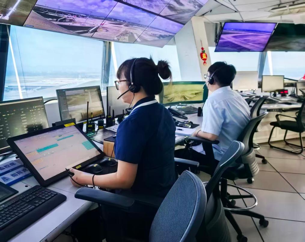 机坪塔台管制员正指挥飞机进出港。(新华社记者王楚然 摄)