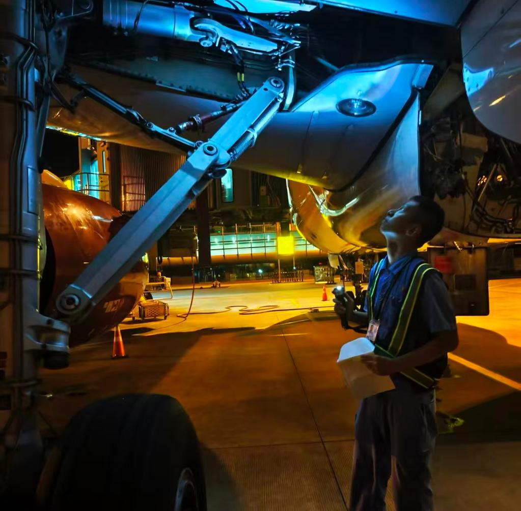 机务人员正检查停场过夜飞机起落架。(南宁机场供图)