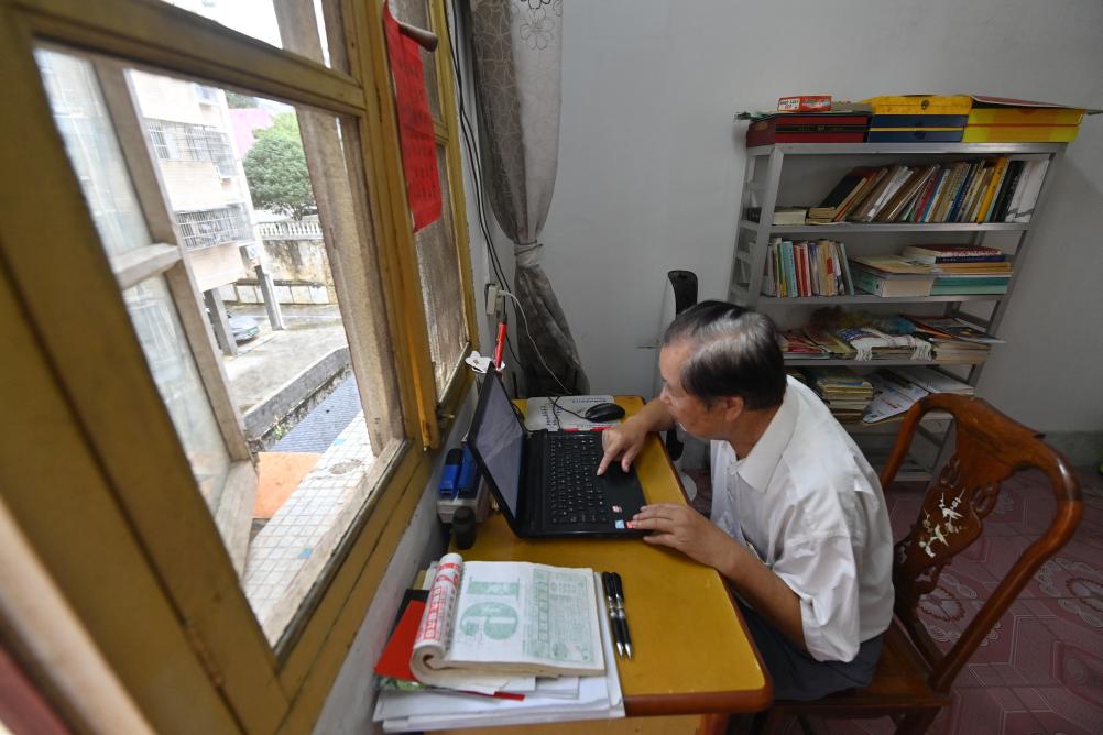 10月15日,罗伏龙在广西巴马瑶族自治县县城的家里查阅有关资料。新华社记者陆波岸 摄