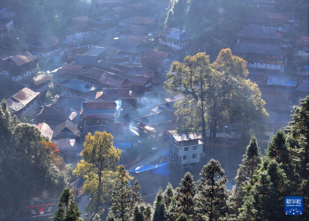 树木掩映下的广西柳州市融水苗族自治县杆洞乡乌英苗寨(无人机照片,2024年11月9日摄)。