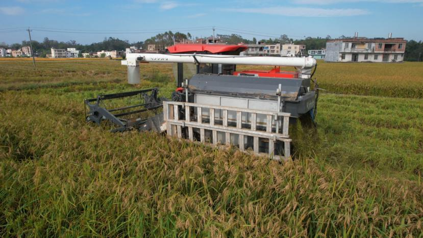 联合收割机正在收割水稻。