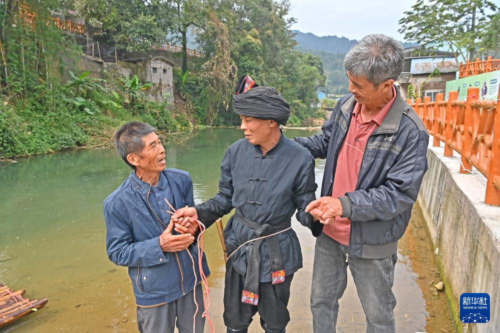 10月29日,来自修仁镇的黄建强(左一)拉着六定村村民黄斌(中)手,回忆当年放木排的情景。新华社记者 周华 摄