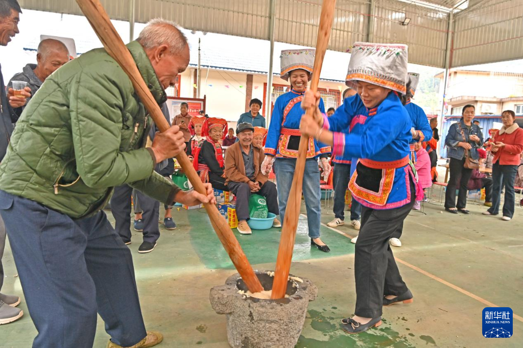 10月29日,两地群众在广西金秀瑶族自治县三角乡六定村打糍粑。新华社记者 周华 摄