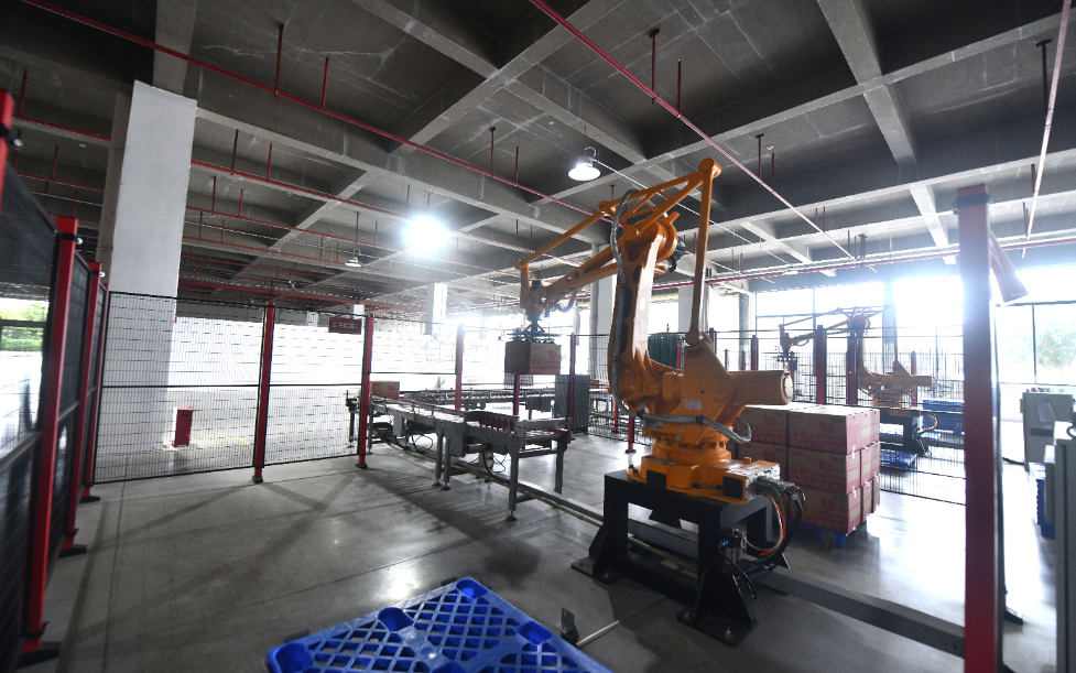 在广西螺霸王食品科技有限公司螺蛳粉仓库,机器人在打包螺蛳粉产品。 新华社记者 黄孝邦 摄