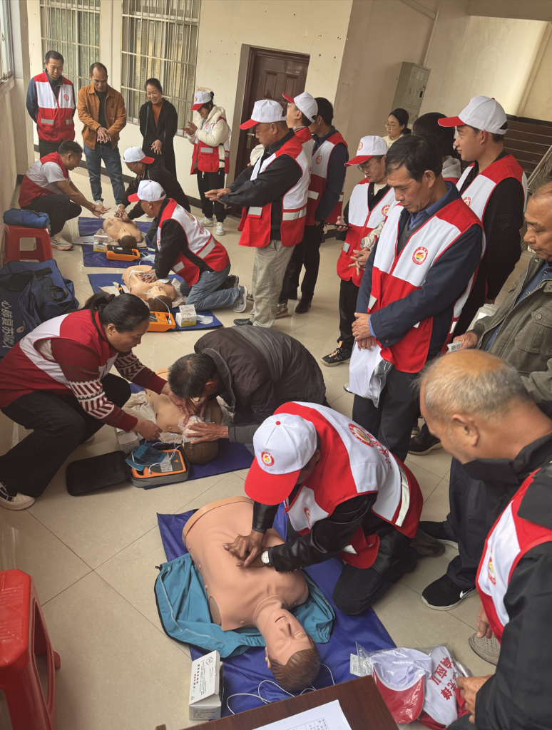 在广西象州县中平镇,乡镇应急干部及社区响应骨干在进行心肺复苏急救实操训练。