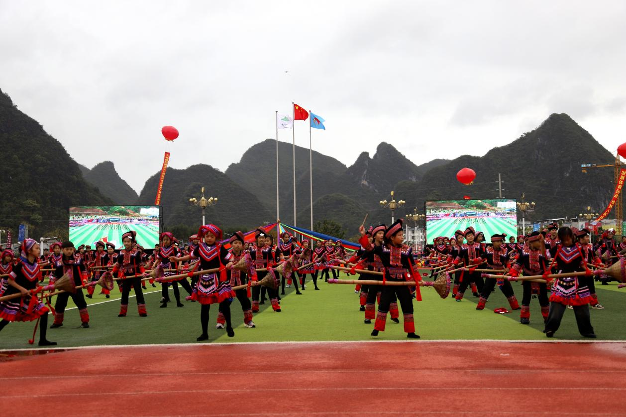 大化一小学生在开幕式上进行非遗《竹鼓舞》表演。