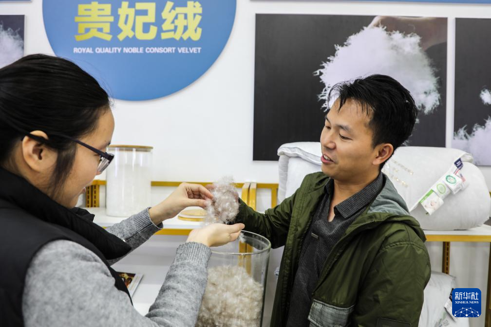 在广西贵港市港南区桥圩镇一家羽绒制品生产企业,工作人员(右)向顾客展示自己企业生产的羽绒(12月18日摄)。