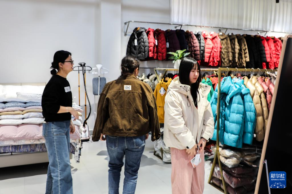 在广西贵港市港南区桥圩镇,消费者在选购羽绒服(12月18日摄)。