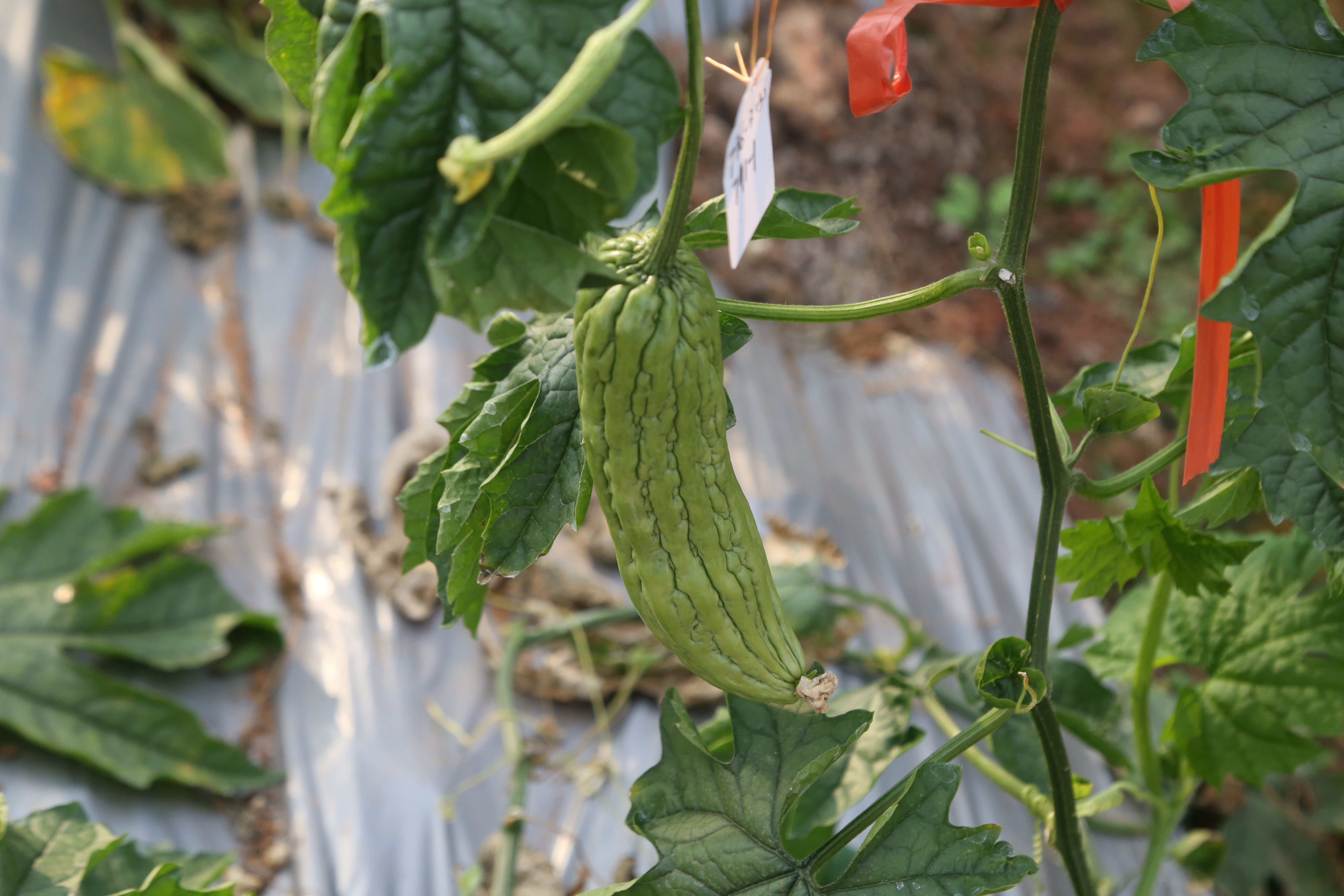刘伟带我们走进苦瓜育种区,他称这里是“苦瓜宝藏基因库”,藤蔓上挂满了形态各异的苦瓜,每一株藤蔓上都贴着标签记录着作物的基因信息。