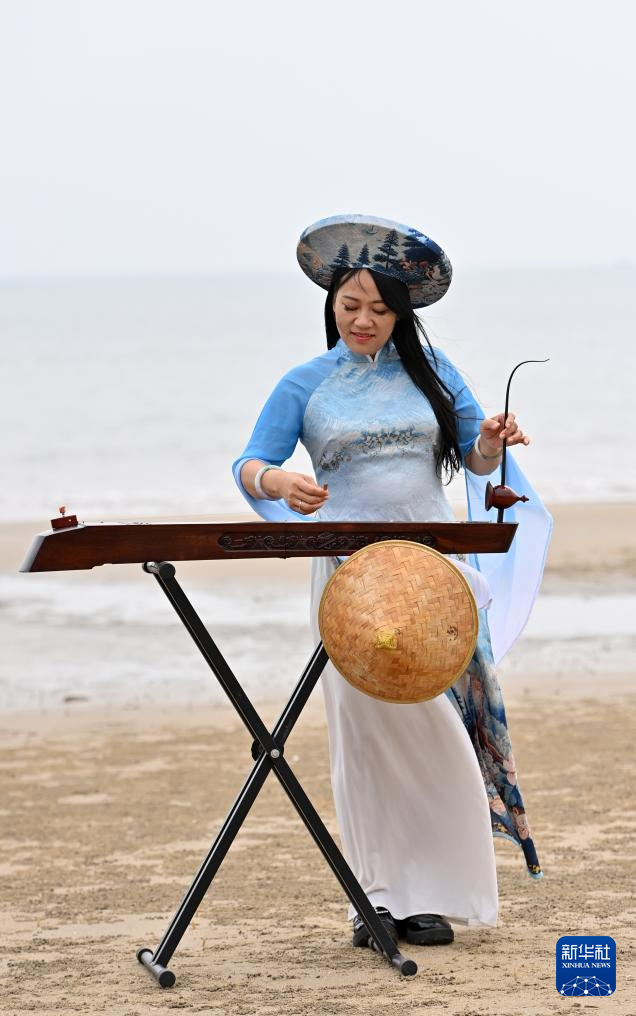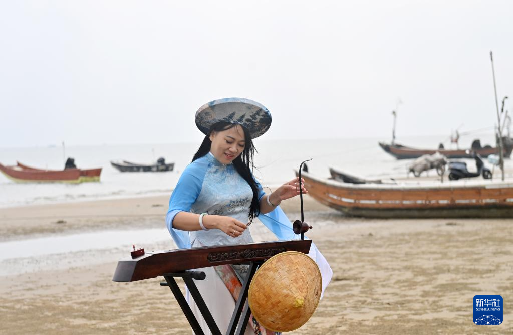 “南风吹拂,隔山又隔海,船夫划桨手已累,好酒未饮已先醉……”在广西东兴市金滩上,苏海珍右手拨动琴弦,左手推拉摇杆,《问月歌》悠扬婉转的旋律飘荡在海边,展现着京族独弦琴独有的艺术魅力。