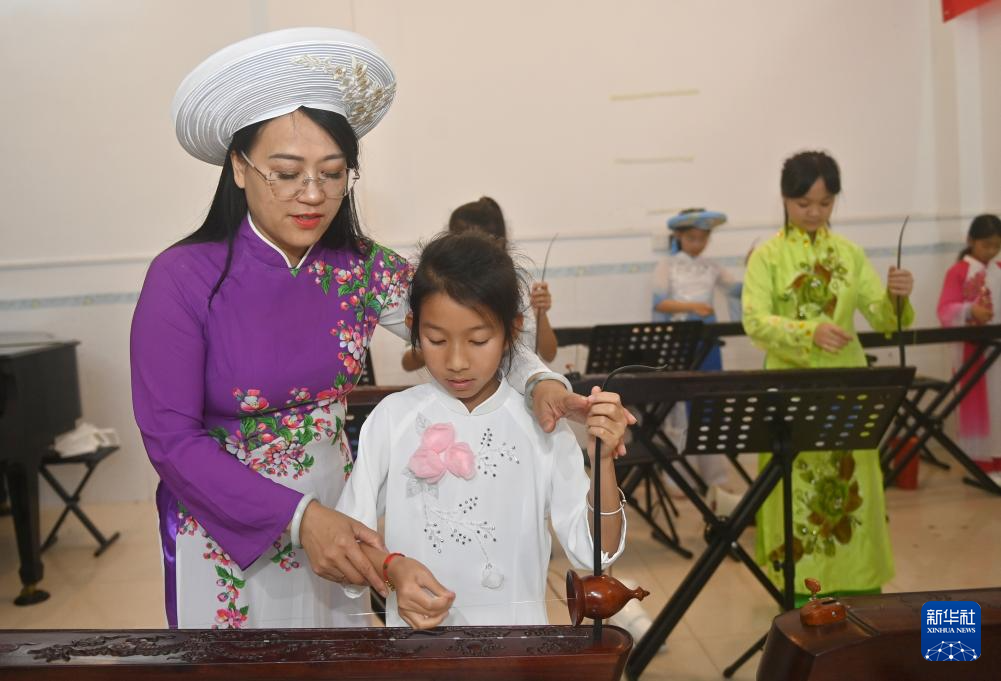 2月6日,在东兴市一弦天海琴歌传承中心,苏海珍指导学生弹奏独弦琴。