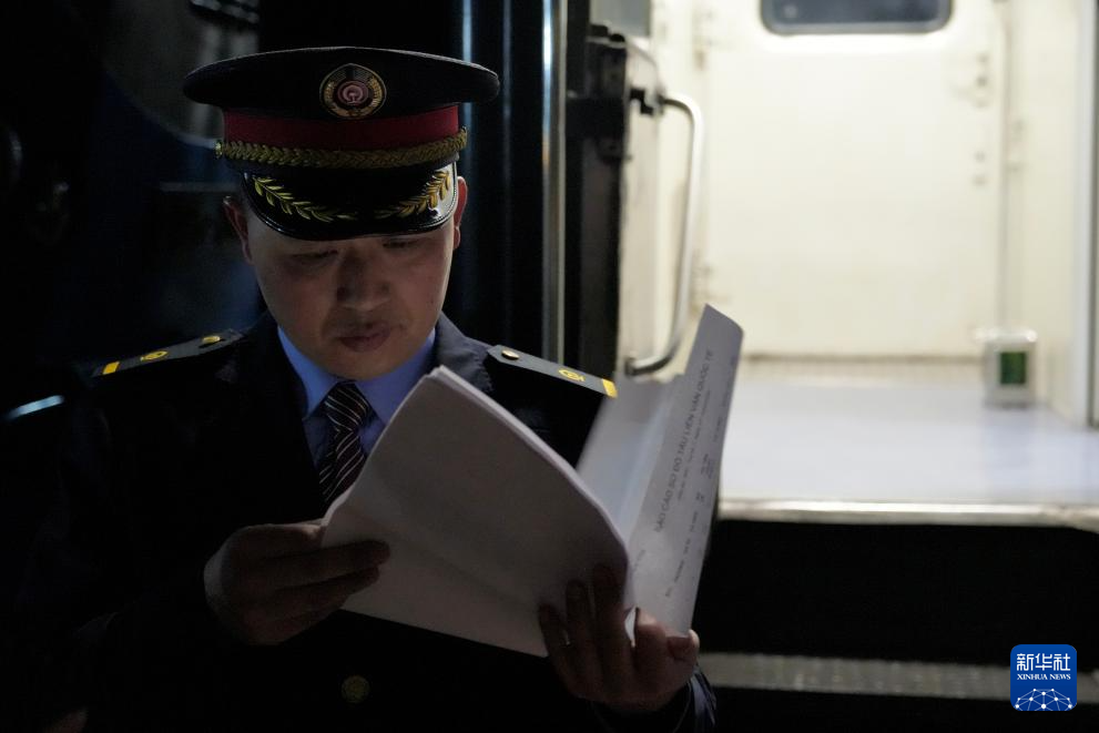 2月10日,在越南河内嘉林站,中越国际联运旅客列车列车长黄俊杰在发车前做准备。