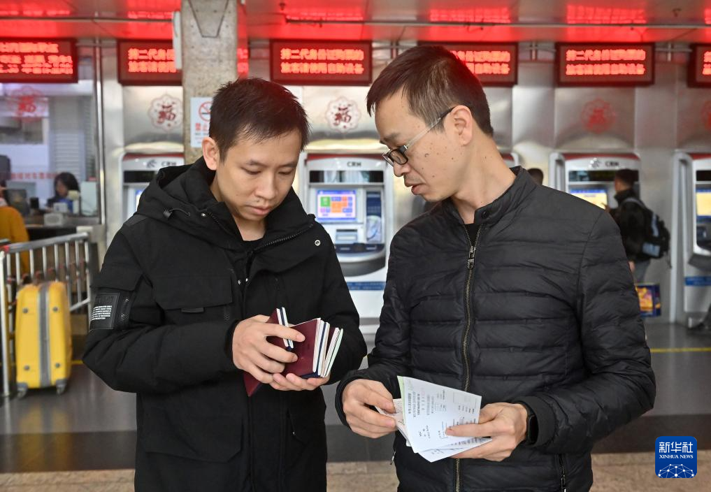 2月11日,在中国广西南宁站,两名旅客在购买春节后前往越南的中越国际联运旅客列车车票后查看有关证件。