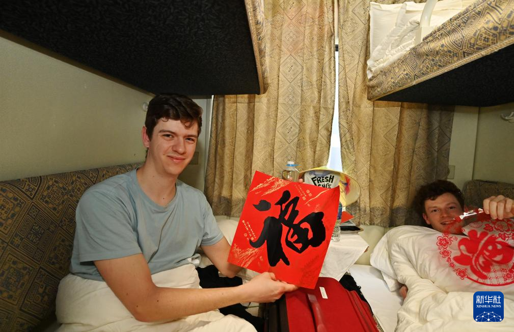 2月11日,乘客在中越国际联运旅客列车上展示获赠的“福”字。