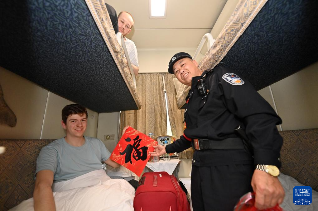 2月11日,中越国际联运旅客列车乘警黄庆明(右)向旅客赠送“福”字表达新春祝福。