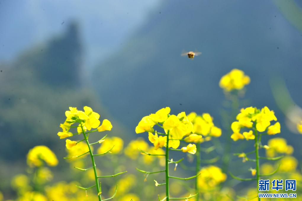 2月20日,一只蜜蜂在广西河池市罗城仫佬族自治县四把镇新印村油菜花田间飞舞。