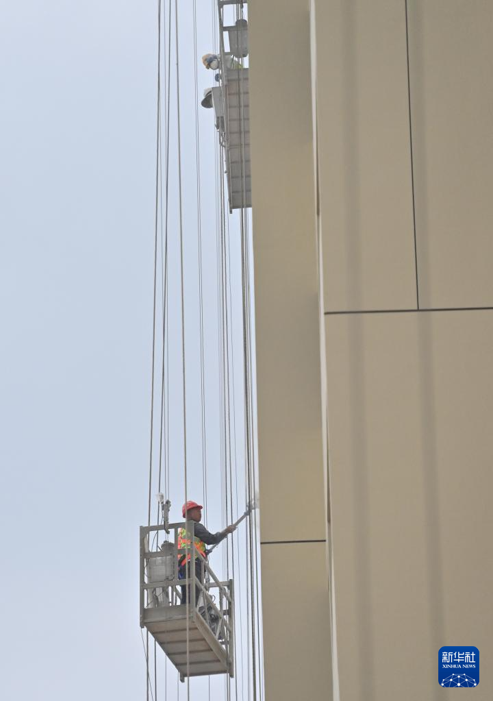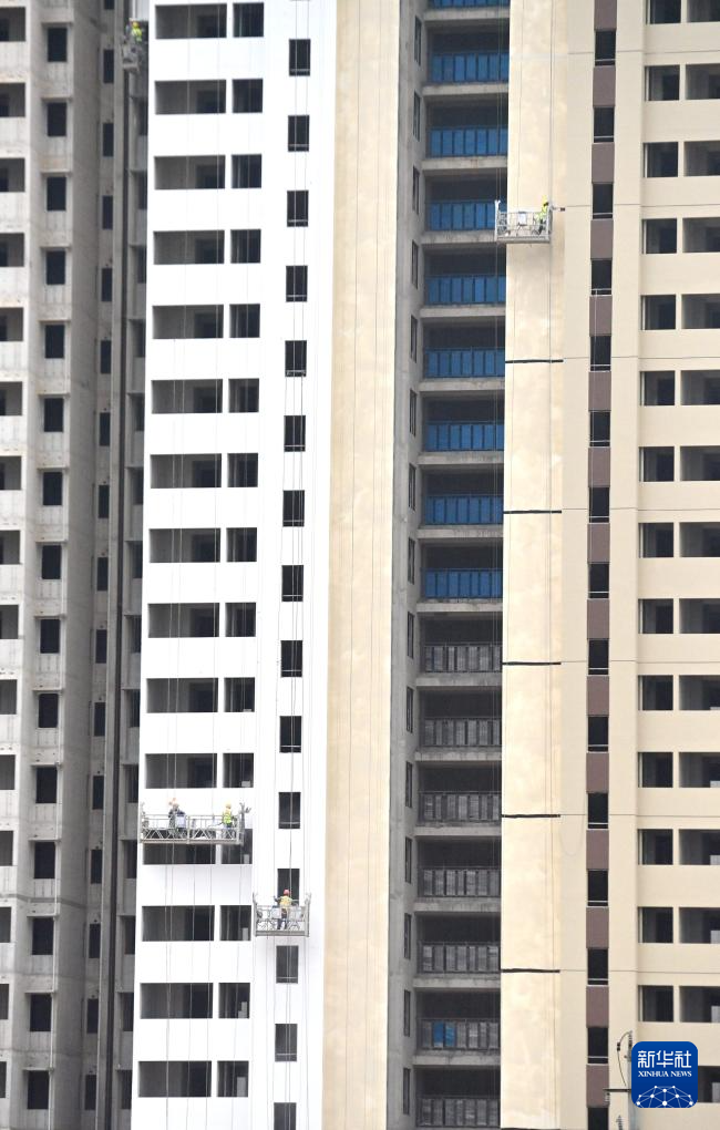 3月16日,在南宁市鸡村城中村改造项目建设现场,中铁二十局工人进行外墙腻子打磨。