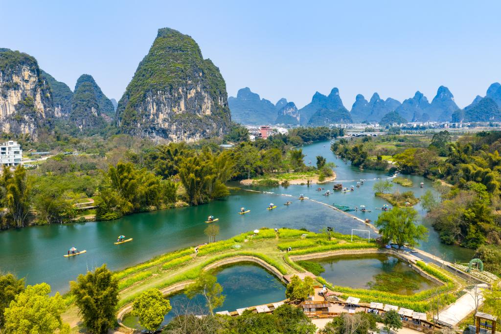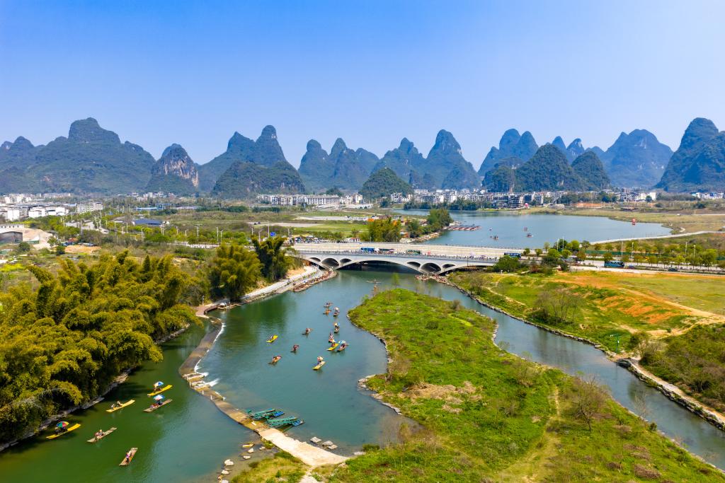 以上图片:2026年3月14日,游客在广西桂林市阳朔县遇龙河万景码头河段游玩。(无人机照片)CICPHOTO/黄胜林 摄