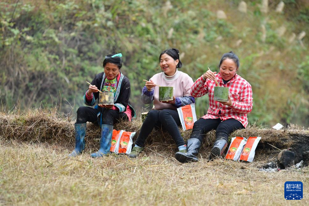 广西融水苗族自治县杆洞乡党鸠村妇女们在田边吃螺蛳粉(2021年12月10日摄)。