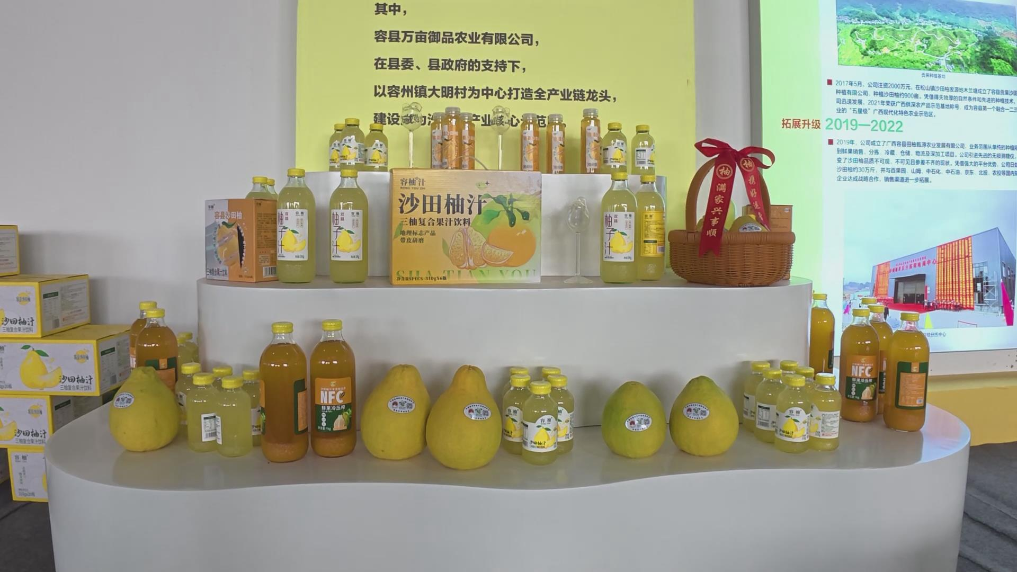 广西容县万亩御品农业有限公司是一家集沙田柚生产、加工、观光旅游、科普教育为一体的农业重点企业。“我们公司开发了柚子汁、柚子茶、柚皮糖等深加工产品。”广西容县万亩御品农业有限公司宣传部负责人陆丽贤介绍,该公司“容柚”牌果汁首月销量即达100万瓶,迅速覆盖两广、川渝等市场。未来公司计划引进先进生产设备,建设沙田柚果汁生产线,项目建成后预计年产果汁200万瓶,产值超2500万元。