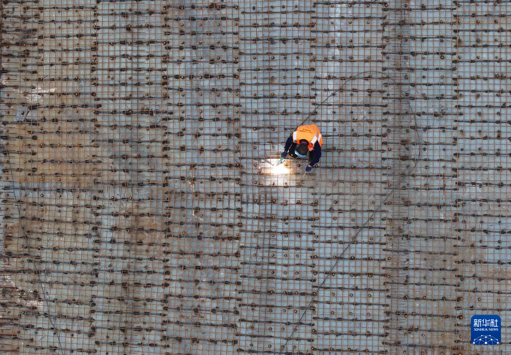 4月21日,中铁二十局的工人在来宾市兴宾区寺山镇柳覃高速公路建设工地作业(无人机照片)。