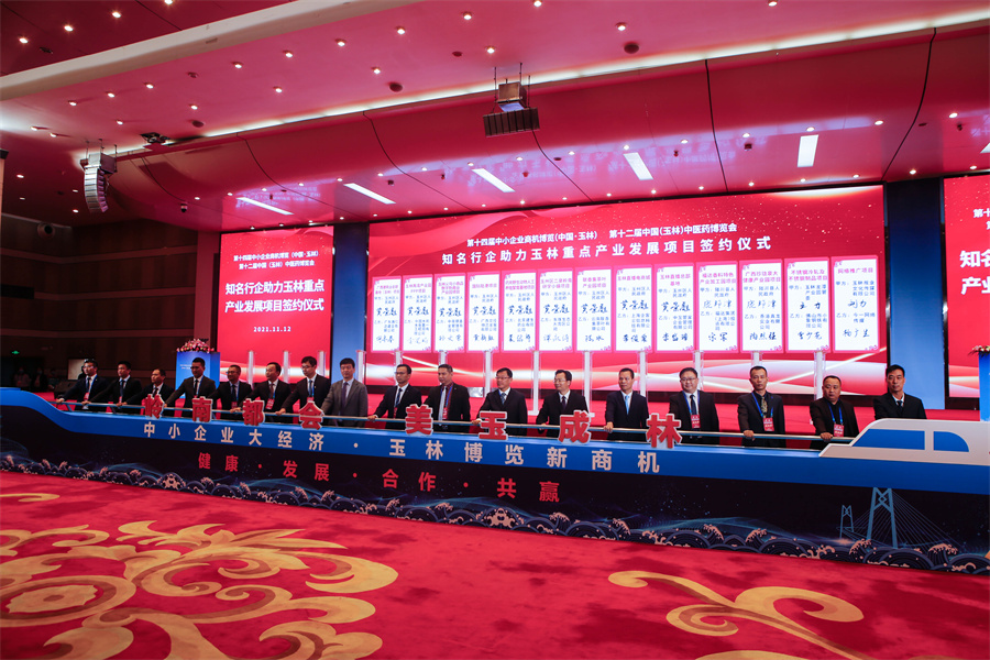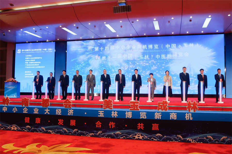开幕式上,领导嘉宾共同启动第十四届中小企业商机博览(中国•玉林)、第十二届中国(玉林)中医药博览会。蒋颖 摄
