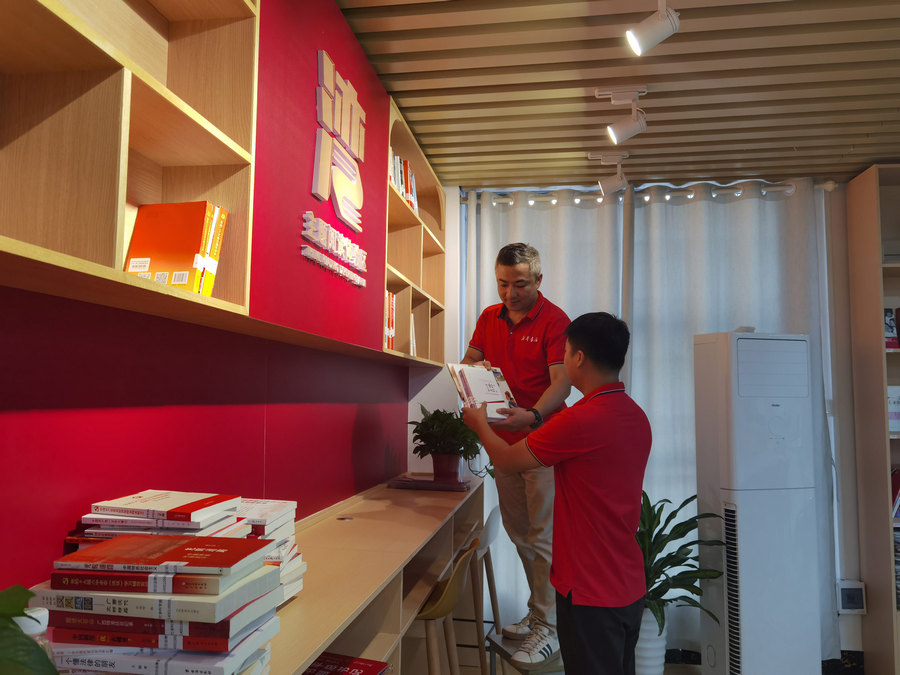 新华书店“红湾”专班工作人员上架图书。