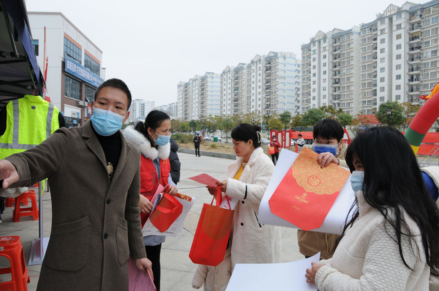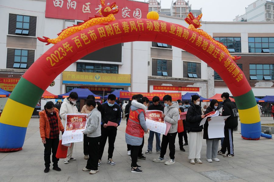 1月26日,农历正月初五,广西百色市田阳区在老乡家园三期举办2023年春风行动暨就业援助月易地搬迁专场招聘会,现场提供田阳区内优质企业19家215个岗位、田阳区外重点企业27家431个岗位,发放宣传材料600多份,到场应聘群众300多人次,达成就业意愿160多人。(黄国顺、农秋靖)