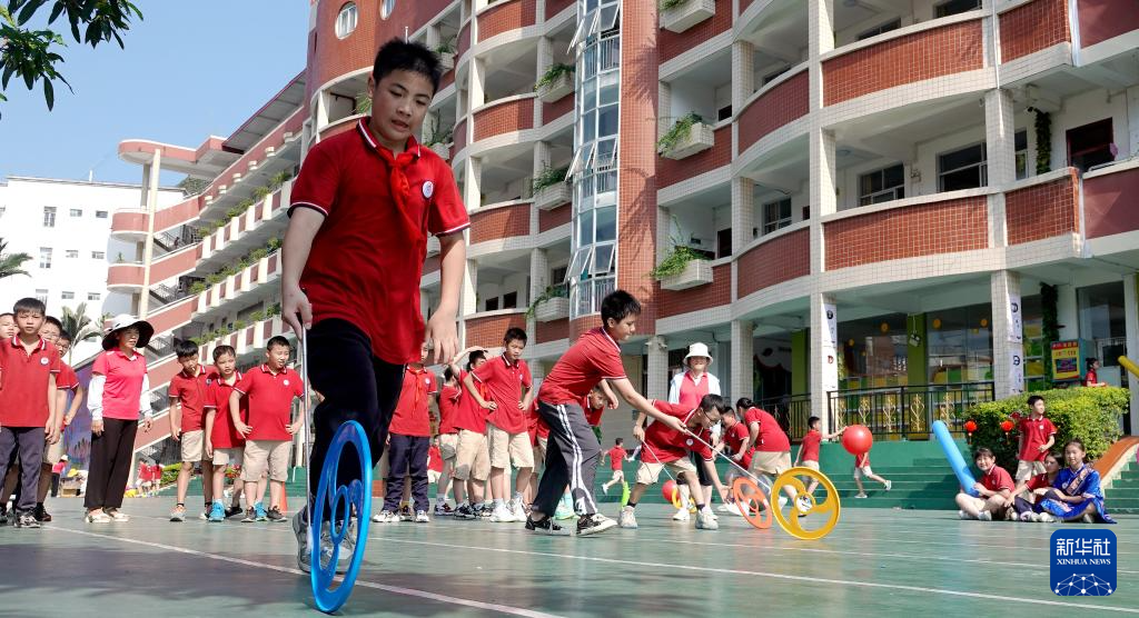 5月31日,广西河池市金城江区第四小学学生在校园参加“滚铁环”趣味游戏。