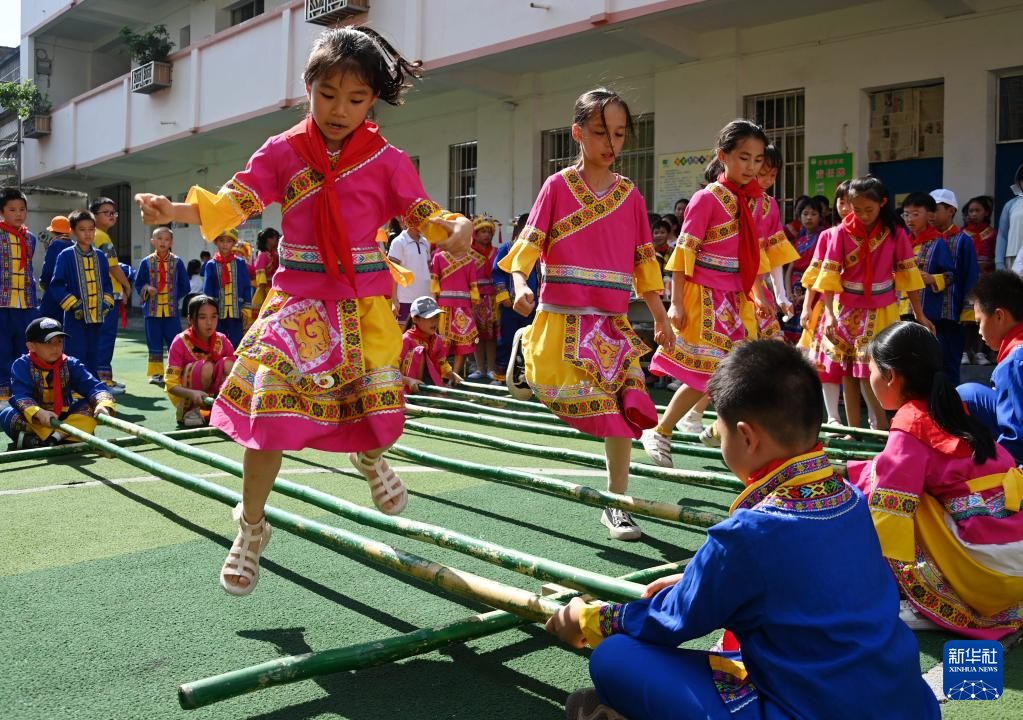 5月30日,在广西罗城仫佬族自治县第二小学,学生参加跳竹竿舞比赛。