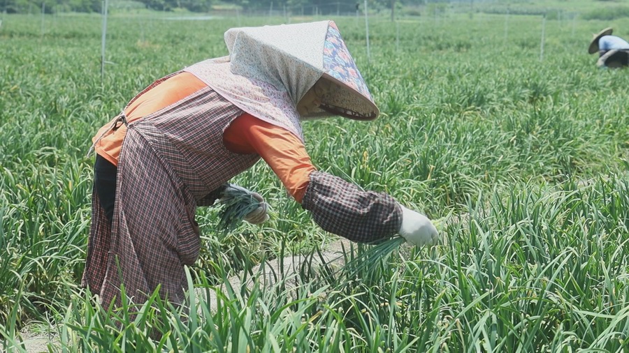 韭菜苔口感鲜甜脆嫩,一年四季都有采收,市场需求量很大。基地在实现致富的同时,也带动当地不少的村民务工增收,其中长期工达85人,主要负责韭菜苔日常采摘、培土、除草等工作。在基地务工的脱贫户王凤玲说道:去年开始来这里上班,每天上7个小时都有80块钱的收入,到下午的时候又可以回家带小孩。工作收入稳定,一年四季都有工做。