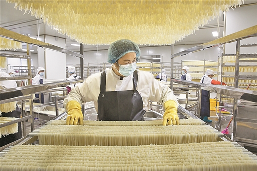 柳州螺蛳粉企业的工人在整理米粉。