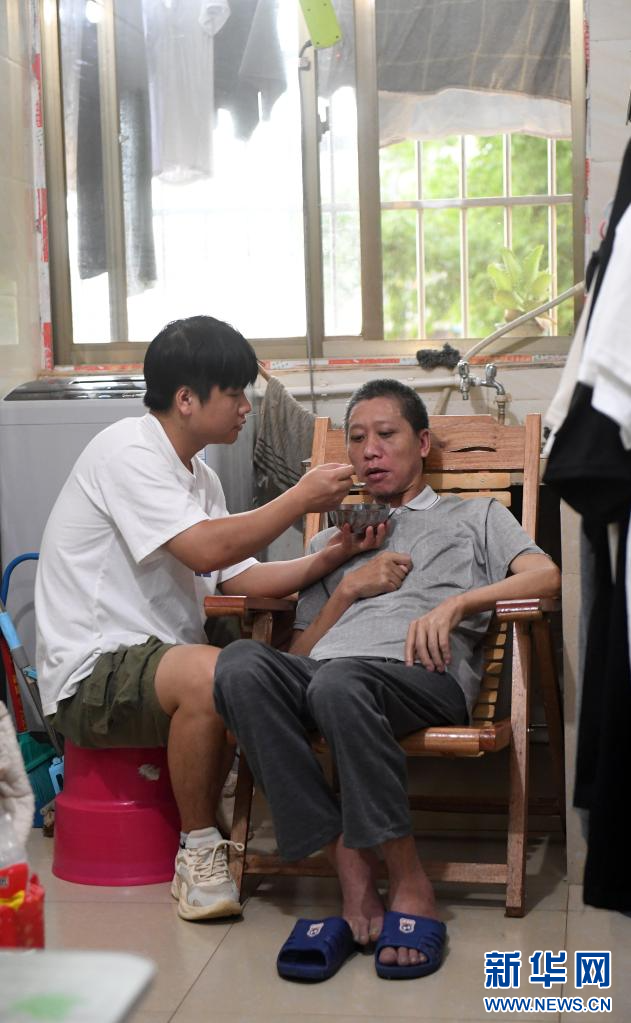 6月17日,在广西南宁,袁东旺在学校附近的出租房里给父亲喂饭。