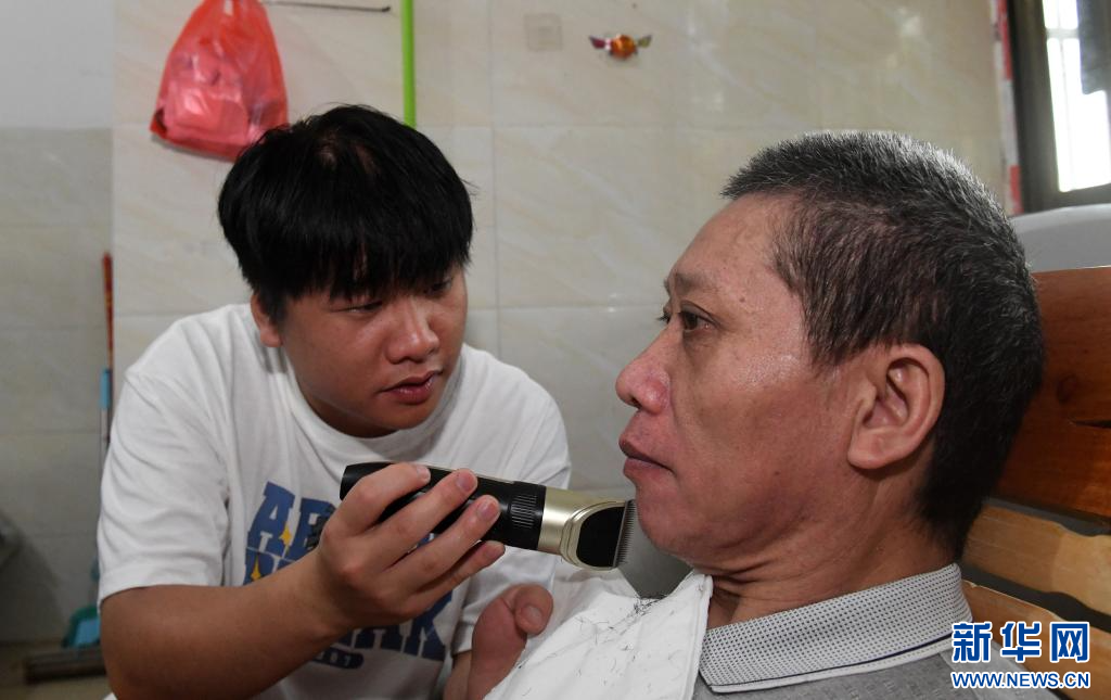 6月17日,在广西南宁,袁东旺在学校附近的出租房里给父亲剃胡子。