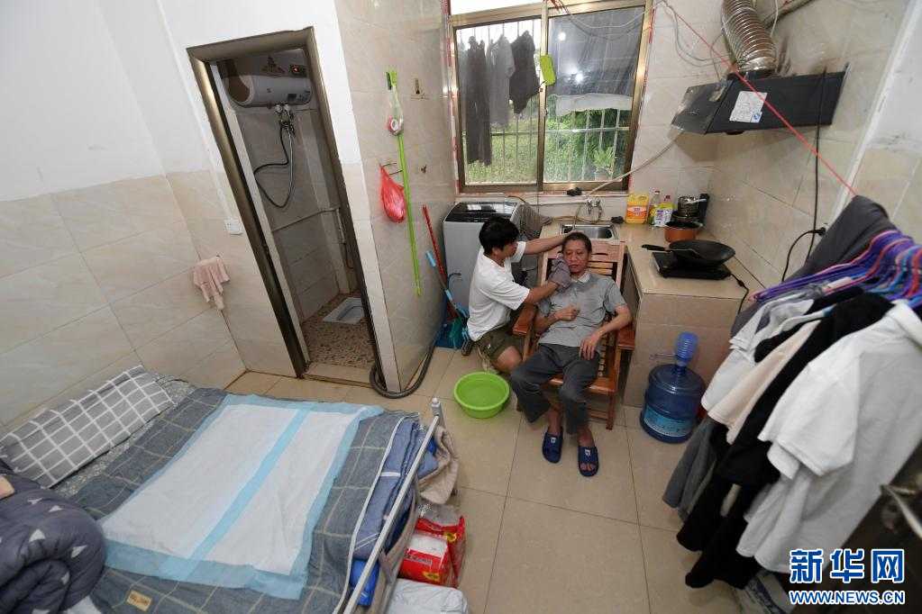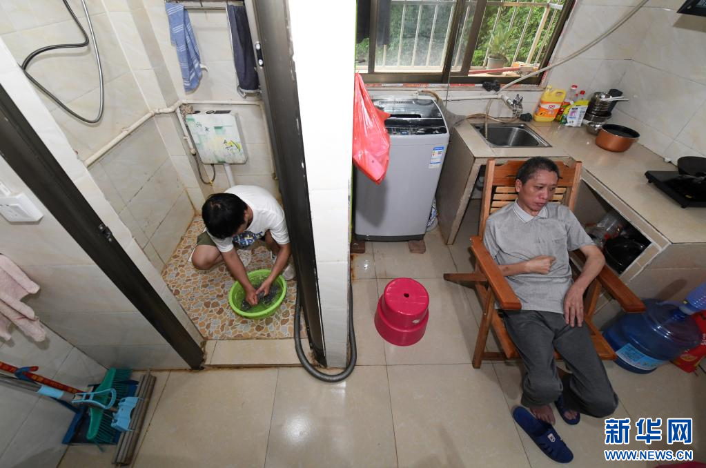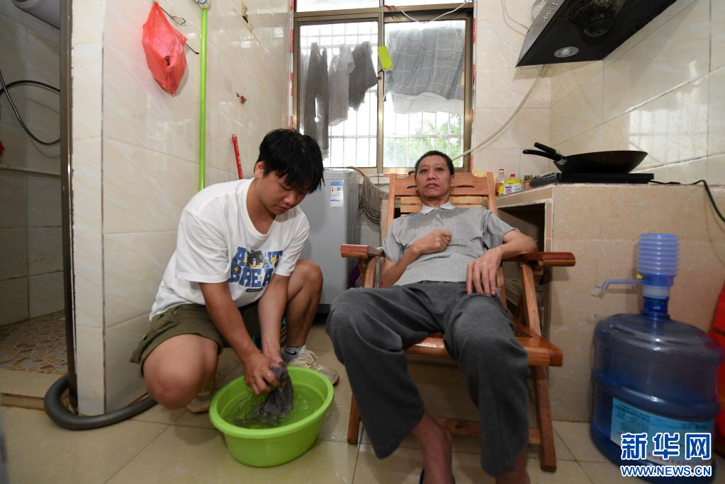 6月17日,在广西南宁,袁东旺在学校附近的出租房里帮父亲洗脸。
