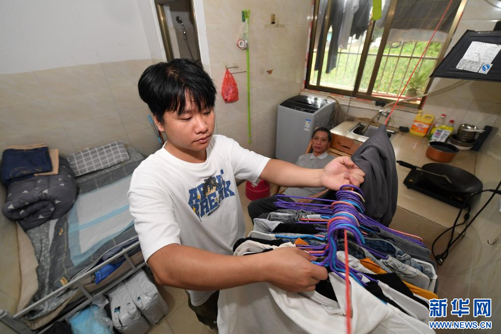 6月17日,在广西南宁,袁东旺在学校附近的出租房里挂衣服。