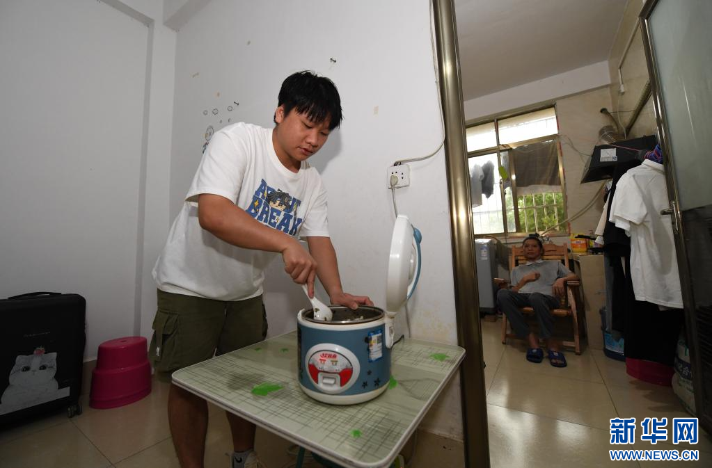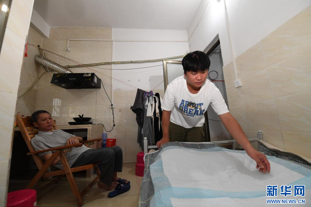 6月17日,在广西南宁,袁东旺在学校附近的出租房里给父亲整理床铺。